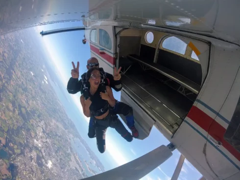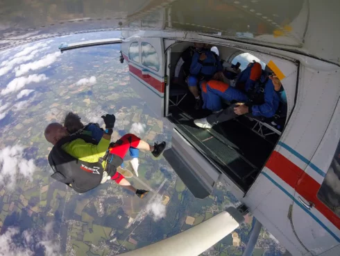 Un appareil photo fixé sur le hauban de l’aile droite, juste en face de la porte de sortie de l’avion, saisie le moment précis et magique ou vous basculez dans le vide.